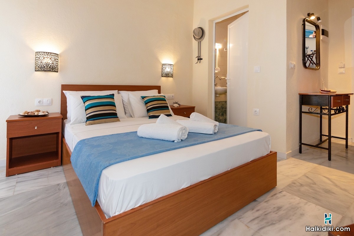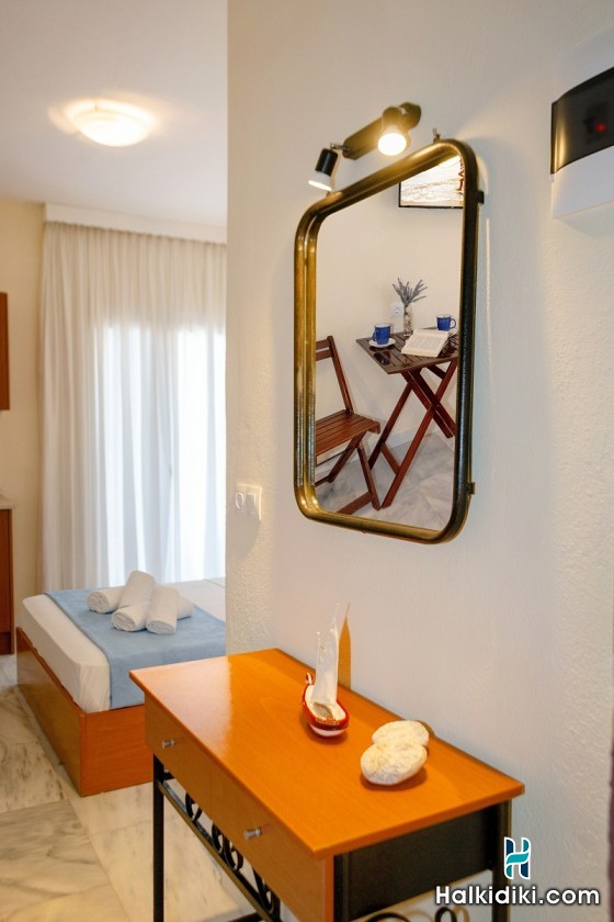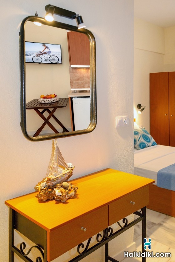 Θα βρείτε δίκλινα studio με ή χωρίς εξοπλισμένη κουζίνα, καθώς και τετράκλινα διαμερίσματα με εξοπλισμένη κουζίνα. Όλα τα studio και διαμερίσματα διαθέτουν λουτρό/WC, κλιματιστικό(A/C), ψυγείο, τηλεόραση και μπαλκόνι. Όποια και αν ειναι η επιλογή σας για τις καλοκαιρινές σας διακοπές (studio ή διαμέρισμα), θα μπορέσετε να απολαύσετε την πανοραμική θέα προς τη θάλασσα, την χερσόνησο του Αγίου Όρους και τις κοντινές παραλίες της Σιθωνίας.